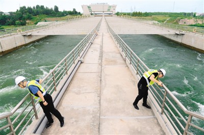 2018年8月14日,南水北調(diào)中線干線滎陽(yáng)管理處工作人員在南水北調(diào)索河渡槽附近巡查渠道安全。新華社記者 魯 鵬 攝