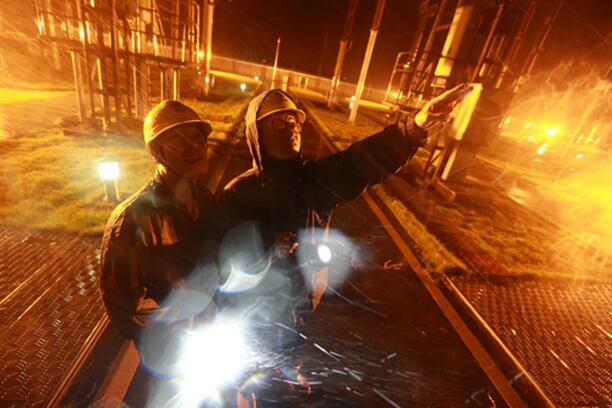 9日23時,500千伏塘嶺變電站進入臺風“利奇馬”12級風圈區(qū)域?耧L肆虐下,國網(wǎng)浙江檢修公司運維人員耳邊的“呼呼”大風一直吹著,主控樓的大門被拍得“砰砰”作響。他們頂風冒雨開展變電設(shè)備夜間特巡,排除設(shè)備隱患,確保主網(wǎng)平安。