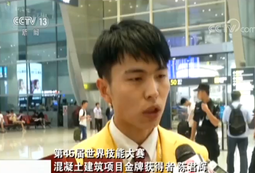 第45屆世界技能大賽混凝土建筑項目金牌獲得者 陳君輝:我們兩個也是第一次參加這個比賽,然后我們國家是第一次參加這個項目,對于很多東西,有很多默認的潛規(guī)則,那些是我們不了解的,就是在這種情況下,我們?nèi)匀荒軌蚰玫焦谲姡@讓我覺得非常自豪。
