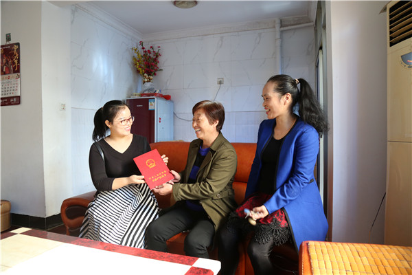 圖為龍巖市發(fā)改委干部為新羅區(qū)梅林新村福樂花園小區(qū)居民送上不動產(chǎn)權(quán)證