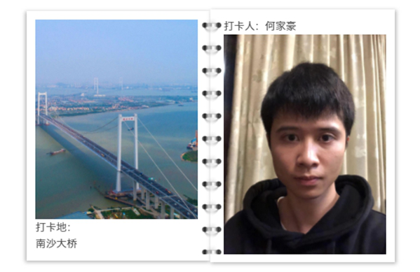 “我叫何家豪,老家在佛山,目前在深圳一家機(jī)器人公司工作。以前春節(jié)只能從虎門大橋回家,‘逢走必堵’。若想避開擁堵,就需要起個(gè)大早或者深夜出發(fā),F(xiàn)在南沙大橋開通后,說走就走,兩個(gè)小時(shí)就能到家。近幾年,競(jìng)技格斗機(jī)器人行業(yè)愈加繁榮,我們團(tuán)隊(duì)每次外出參加比賽,都會(huì)從南沙大橋經(jīng)過,有種南沙大橋送我‘出征’的感覺,這種感覺很奇妙!”打卡人何家豪說。