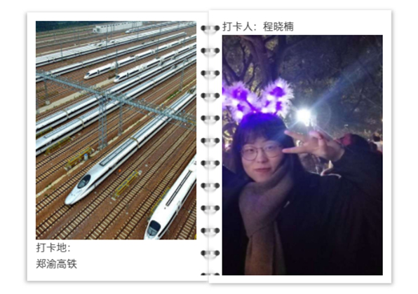 “我叫程曉楠,是湖南工業(yè)大學(xué)研一的學(xué)生。從湖南株洲到河南平頂山的直達(dá)列車很少,每次路上都得折騰一天一夜,回一次家,整個(gè)人都精疲力盡的。鄭渝高鐵鄭襄段開通了,以前3小時(shí)的路程,現(xiàn)在47分鐘就能到平頂山,很方便,所以坐高鐵成了我的第一選擇! 打卡人程曉楠說。