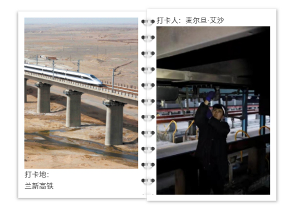 “我叫麥爾旦·艾沙,是中國(guó)鐵路烏魯木齊局集團(tuán)有限公司烏魯木齊車輛段的一名‘00后’職工,日常工作是對(duì)入庫(kù)的車體進(jìn)行檢查和維修,確保車輛安全、平穩(wěn)地運(yùn)行。對(duì)每個(gè)螺絲我都擰得特別認(rèn)真,現(xiàn)在火車速度越來越快了,對(duì)檢修的要求特別高,修車人要時(shí)刻想著坐車人。今年是我參加工作的第一年,我最大的愿望就是帶著爸媽坐上我檢修的火車去上海旅游,讓爸媽為我驕傲!希望更多維吾爾族兄弟姐妹坐著我檢修的列車走出去看看!”打卡人麥爾旦·艾沙說。