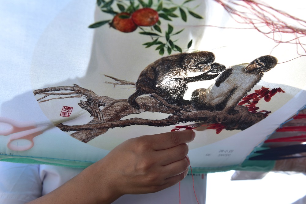 △四川某參賽選手正在2020年民間手藝人技能大賽中展示蜀繡技藝