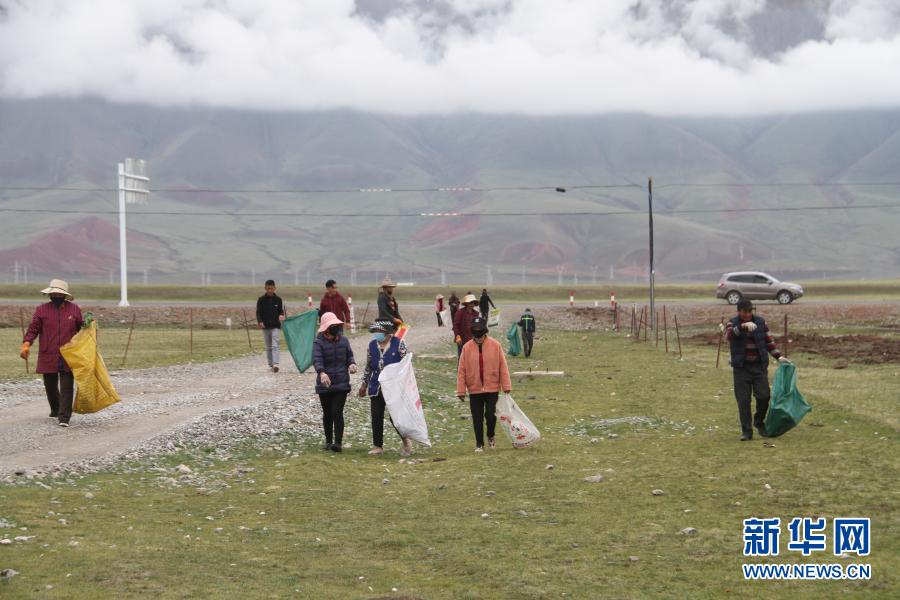 三江源國家公園治多生態(tài)環(huán)保協(xié)會的志愿者在撿拾垃圾(6月15日攝)。新華社發(fā)