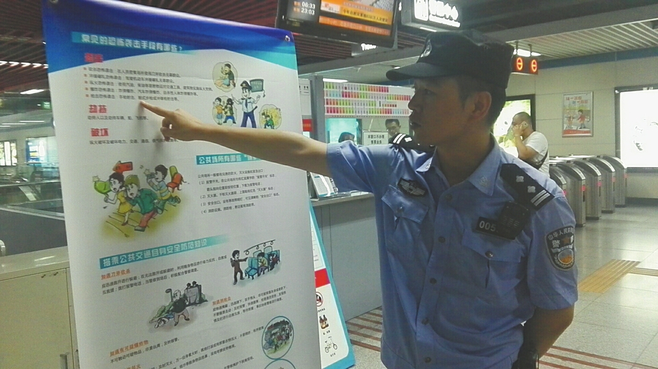 成都市公安局公交地鐵分局升仙湖站派出所副所長李欣向乘客介紹地鐵站安防知識。