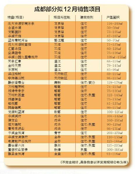 記者梳理龍泉驛、雙流、溫江、郫都、成華、青羊、金牛及都江堰、天府新區(qū)等地樓盤公開信息發(fā)現(xiàn),包括華潤、萬科、恒大、融創(chuàng)、龍湖、置信、藍光、朗詩、嘉裕、東原、金科、中海等品牌開發(fā)商在內(nèi),12月份預(yù)計有32個項目、8000多套房源待售,其中別墅物業(yè)項目有7個,住宅物業(yè)25個,產(chǎn)品面積從最小戶型套二到大面積套四套五戶型皆有,剛需及改善購房者的選擇性范圍都比較大。某開發(fā)商營銷負責(zé)人告訴記者,目前公司正在等待相關(guān)部門落實具體的搖號選房操作辦法,一旦獲得預(yù)售證就將開盤。