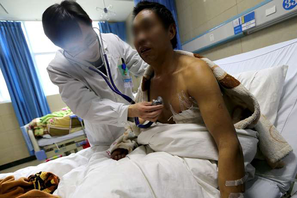 “馬上開車就往醫(yī)院送,顧不上打120了!毙姨澁(dāng)時(shí)人多,鄰居開著車和伍先生兒子趕緊將其送到最近的四川省人民醫(yī)院資陽醫(yī)院,平時(shí)需要半個小時(shí)的路程,這次只開了10多分鐘。醫(yī)院急診胸部CT檢查,發(fā)現(xiàn)鐵鍬刺破了伍先生的心臟,在左胸和心包內(nèi)形成了大量的積血,情況十分危急。