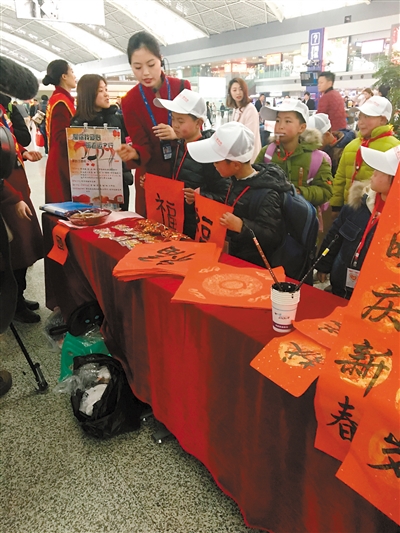 在雙流機場工作的張原在微信朋友圈看到“‘小候鳥’去南方”征集活動后,也立即加入了這場愛心活動。張原是機場候機樓管理中心班組長,22日“小候鳥”們乘機當天,她和她的同事們帶著“小候鳥”們參觀候機樓,讓“小候鳥”學習安檢知識和登機程序。在候機樓,“小候鳥”們還寫下了喜氣洋洋的“!弊郑@得了美味的甜品。
