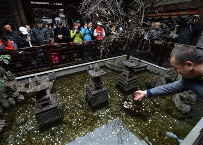 寬窄巷子記憶四川館今年1月中旬正式運(yùn)營。館內(nèi)古色古香,擺放著各式各樣具有四川特色的茶具、盆景。然而,7日上午10點(diǎn),記者在館中發(fā)現(xiàn),一處10平米不到的普通水池周圍圍滿了游客。這些游客有的駐足觀看,有的忘情自拍,更有不少游客掏出口袋中的硬幣,將1元、5角、1角硬幣拋向水池,或是瞄準(zhǔn)水池中矗立著的3座燭塔,躊躇滿志打算將硬幣拋在塔頂。
