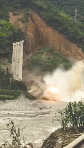 一開始,畫面中的一大片山體就開始垮塌,沖向位于河邊的六根至少10多米高的橋墩。伴隨著圍觀人群的驚呼聲,最右邊的兩個橋墩最先出現(xiàn)明顯的傾斜,僅僅3秒的時間,橋墩下的山體也開始垮塌,橋墩倒向河中,與此同時,中間的兩根橋墩也開始傾斜。