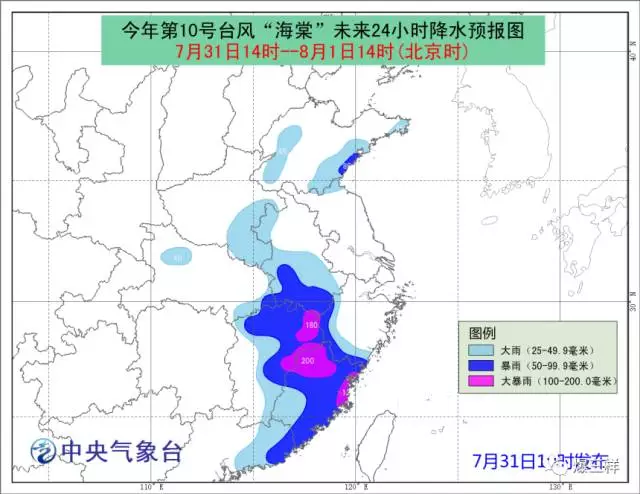 中央氣象臺7月31日10時繼續(xù)發(fā)布暴雨黃色預(yù)警:預(yù)計7月31日14時至8月1日14時,福建、廣東東部、江西東部和北部、浙江西南部、安徽西南部、湖北東部、河南東南部、山東東南部等地有大雨或暴雨,其中,福建西北部和東部、江西東北部等地的部分地區(qū)有大暴雨(100~200毫米),最大小時雨強可達(dá)60毫米。