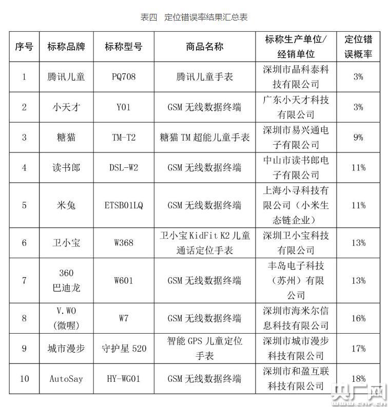 此外,由于目前兒童智能手表的重要用途之一是定位,本次試驗(yàn)測(cè)試了10塊兒童智能手表的定位準(zhǔn)確性。結(jié)果顯示,兒童智能手表在地下或嘈雜環(huán)境中定位易出錯(cuò)。在10塊兒童智能手表樣品中,僅有“騰訊兒童”和“小天才”的定位錯(cuò)誤概率小于5%,另外8塊的定位錯(cuò)誤概率超過(guò)5%(詳見(jiàn)表四)。兒童智能手表定位易出錯(cuò)的地點(diǎn)主要集中在地下停車(chē)場(chǎng)、地鐵站、環(huán)境嘈雜的商場(chǎng)等區(qū)域,而在學(xué)校、醫(yī)院等區(qū)域定位準(zhǔn)確性比較理想。