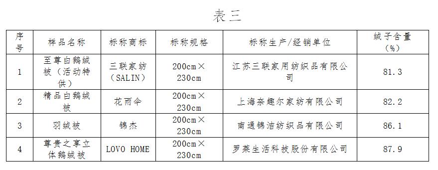 在充絨量相同的情況下,羽絨被的絨子含量越高其保暖性也越好。絨子含量是指絨子在羽絨填充物中的含量百分比。按照相關(guān)行業(yè)標準要求,絨子含量允許有5%的負偏差。本次比較試驗的30件樣品均標稱絨子含量(或含絨量)達到95%,測試結(jié)果顯示絨子含量最高為94.4%,最低為81.3%。其中26件樣品的絨子含量大于90%,4件樣品絨子含量較低(詳見表三)。