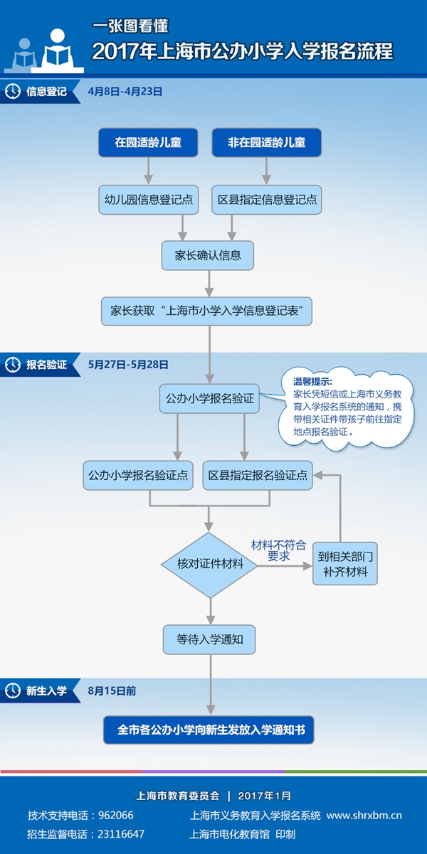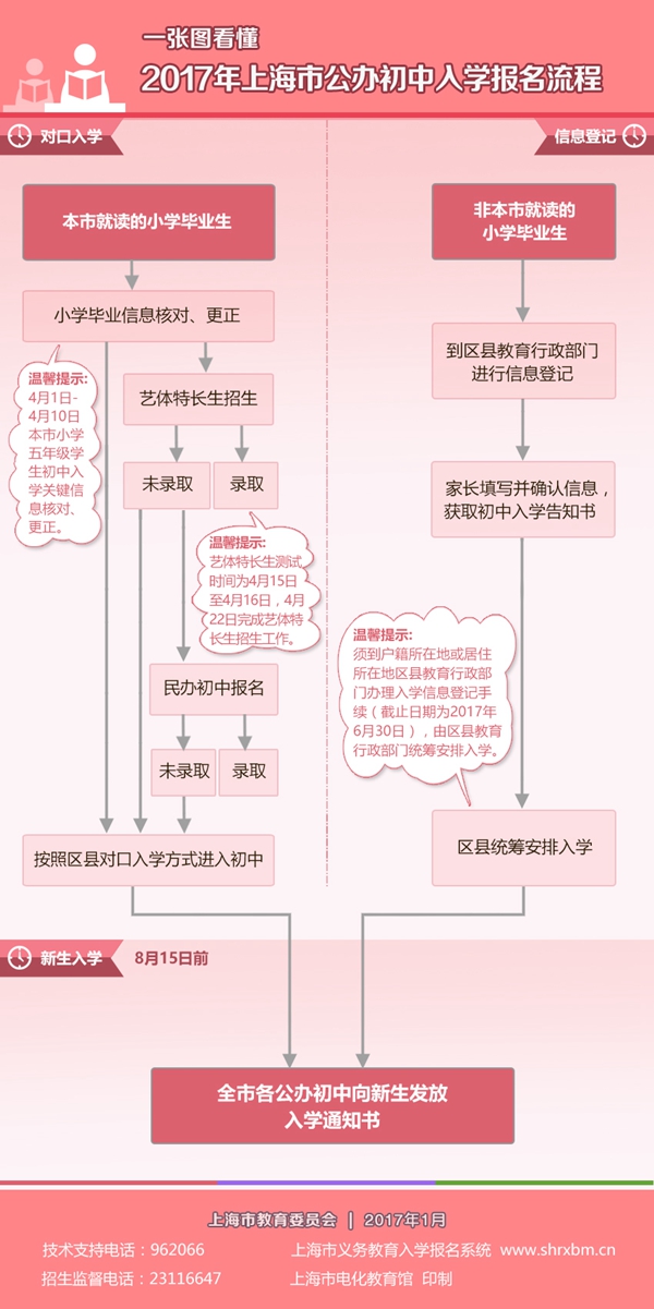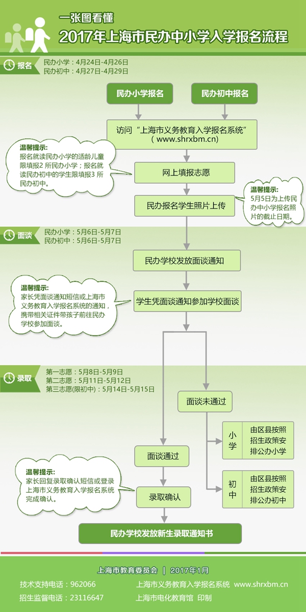 央廣網(wǎng)上海1月6日消息(記者吳善陽(yáng) 唐奇云) 上海市教委日前公布《2017年本市義務(wù)教育階段學(xué)校招生入學(xué)工作的實(shí)施意見》,相關(guān)政策整體保持穩(wěn)定,同時(shí)另為學(xué)生家長(zhǎng)附上本市公辦及民辦中小學(xué)入學(xué)報(bào)名流程圖解——
