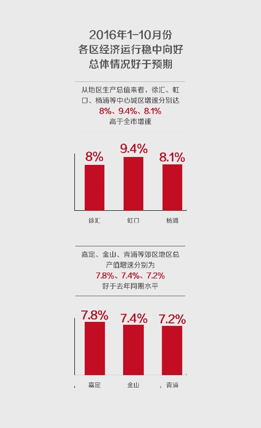 從地區(qū)生產(chǎn)總值來(lái)看,徐匯、虹口、楊浦等中心城區(qū)增速分別達(dá)8%、9.4%、8.1%,高于全市增速;嘉定、金山、青浦等郊區(qū)地區(qū)總產(chǎn)值增速分別為7.8%、7.4%、7.2%,好于去年同期水平。