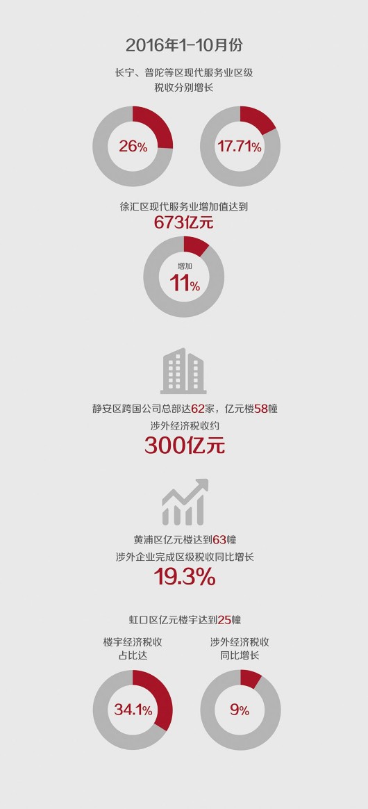 去年1-10月,長(zhǎng)寧、普陀等區(qū)現(xiàn)代服務(wù)業(yè)區(qū)級(jí)稅收分別增長(zhǎng)26%、17.71%;徐匯區(qū)現(xiàn)代服務(wù)業(yè)增加值達(dá)到673億元,增加11%。靜安區(qū)跨國(guó)公司總部達(dá)62家,億元樓58幢,涉外經(jīng)濟(jì)稅收約300億元;黃浦區(qū)億元樓達(dá)到63幢,涉外企業(yè)完成區(qū)級(jí)稅收同比增長(zhǎng)19.3%;虹口區(qū)億元樓宇達(dá)到25幢,樓宇經(jīng)濟(jì)稅收占比達(dá)34.1%,涉外經(jīng)濟(jì)稅收同比增長(zhǎng)9%。