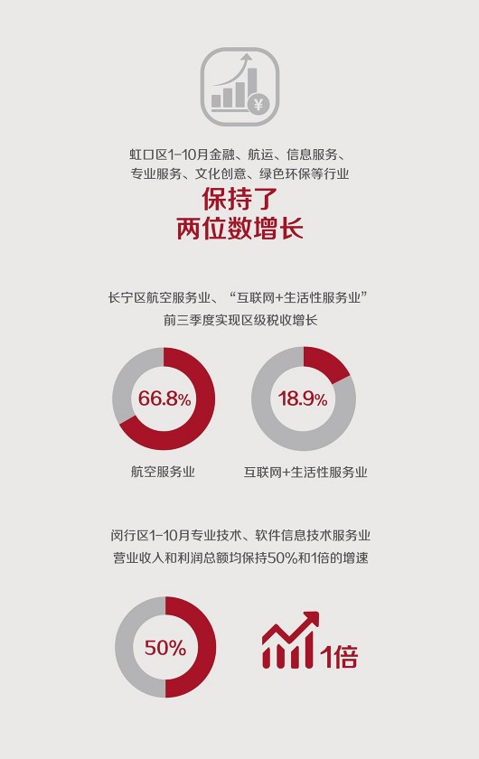 新興服務(wù)業(yè)發(fā)展加速。去年,虹口區(qū)1-10月金融、航運(yùn)、信息服務(wù)、專業(yè)服務(wù)、文化創(chuàng)意、綠色環(huán)保等行業(yè)保持了兩位數(shù)增長(zhǎng);長(zhǎng)寧區(qū)航空服務(wù)業(yè)、“互聯(lián)網(wǎng)+生活性服務(wù)業(yè)”前三季度實(shí)現(xiàn)區(qū)級(jí)稅收增長(zhǎng)66.8%和18.9%;閔行區(qū)1-10月專業(yè)技術(shù)、軟件信息技術(shù)服務(wù)業(yè)營(yíng)業(yè)收入和利潤(rùn)總額均保持50%和1倍的增速。
