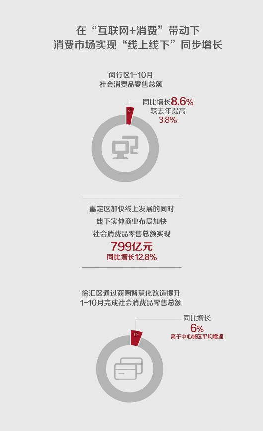 在“互聯(lián)網(wǎng)+消費(fèi)”帶動(dòng)下,消費(fèi)市場(chǎng)實(shí)現(xiàn)“線上線下”同步增長(zhǎng)。閔行區(qū)1-10月社會(huì)消費(fèi)品零售總額同比增長(zhǎng)8.6%,較去年提高3.8個(gè)百分點(diǎn),日用家電在蘇寧云商的帶動(dòng)下零售額增長(zhǎng)近2倍;嘉定區(qū)加快線上發(fā)展的同時(shí),線下實(shí)體商業(yè)布局加快,社會(huì)消費(fèi)品零售總額實(shí)現(xiàn)799億元,同比增長(zhǎng)12.8%,“嘉境通”實(shí)現(xiàn)跨境電子商務(wù)交易額9878.9萬(wàn)元;徐匯區(qū)通過(guò)商圈智慧化改造提升,1-10月完成社會(huì)消費(fèi)品零售總額同比增長(zhǎng)6%,高于中心城區(qū)平均增速。