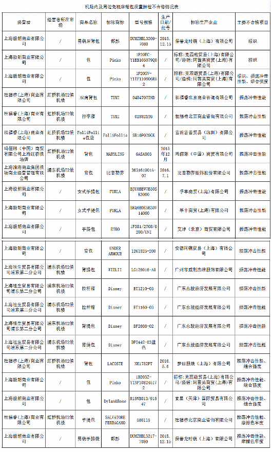 浦東機(jī)場(chǎng)T2候機(jī)樓內(nèi)的上海祖生貿(mào)易有限公司浦東第二分公司銷售的4批次標(biāo)稱由廣東永駿經(jīng)濟(jì)發(fā)展有限公司生產(chǎn)(供貨)的“Disney”拉桿箱或背提包,都被檢出振蕩沖擊性能不合格。