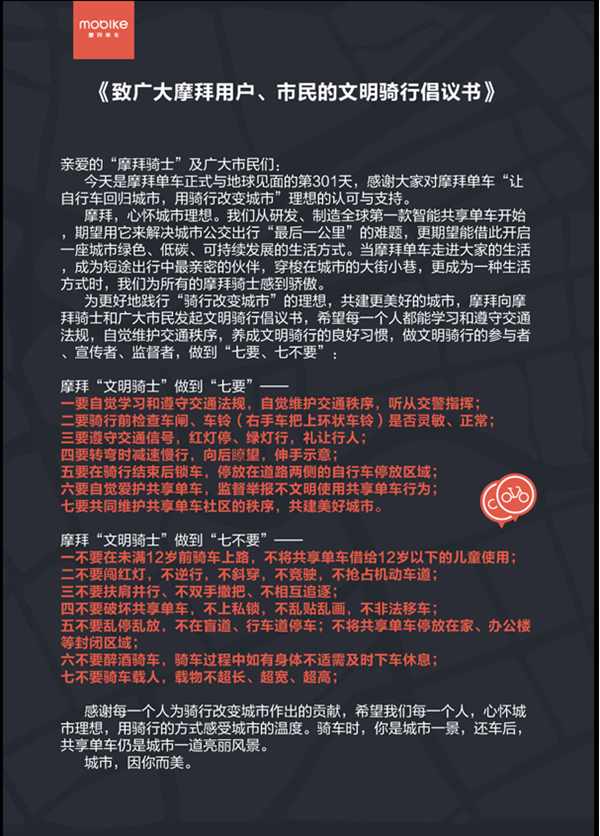 日前,共享單車行業(yè)的領(lǐng)導(dǎo)者摩拜單車發(fā)起全國(guó)首個(gè)文明騎行倡議活動(dòng),倡導(dǎo)廣大用戶和市民主動(dòng)學(xué)習(xí)和遵守本地交通規(guī)則,積極踐行文明騎行,自覺愛護(hù)共享單車,共同助力美好城市建設(shè)。