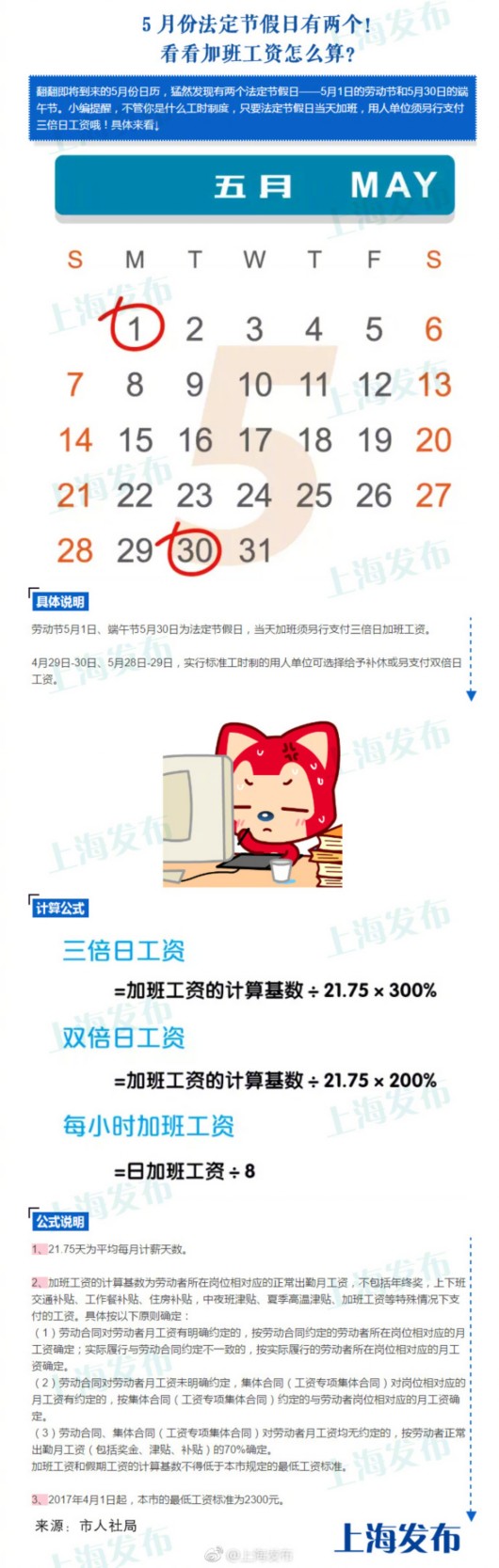 據(jù)上海發(fā)布,除了馬上到來的勞動節(jié),5月還有端午節(jié)小長假哦~萬一你要加班,加班費該怎么算?@上海12333 說,勞動節(jié)5月1日、端午節(jié)5月30日為法定節(jié)假日,當天加班須另行支付三倍日加班工資;4月29日-30日、5月28日-29日,可給予補休或另支付雙倍日工資。今年4月1日起,本市最低工資已調(diào)為2300元/月。