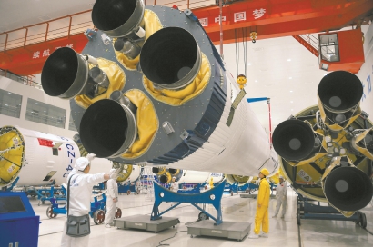 上海航天149廠的火箭總裝人員給箭體稱重。