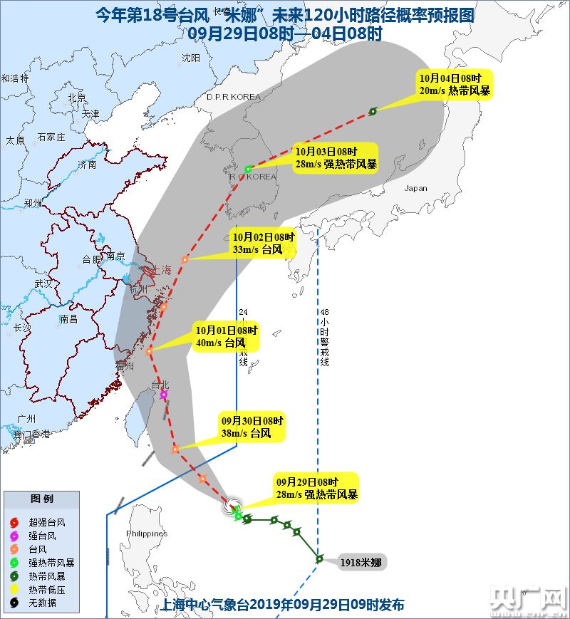 預計“米娜”將于30日晚上擦過臺灣島東北部,爾后逐漸轉向偏北方向移動,10月1日下午到傍晚擦過浙江中北部沿;蚪1鄙,也不排除在上述地區(qū)登陸可能,1日夜間到2日早晨在上海以東100~150公里處越過上海同緯度(臺風級,33~38米/秒)。