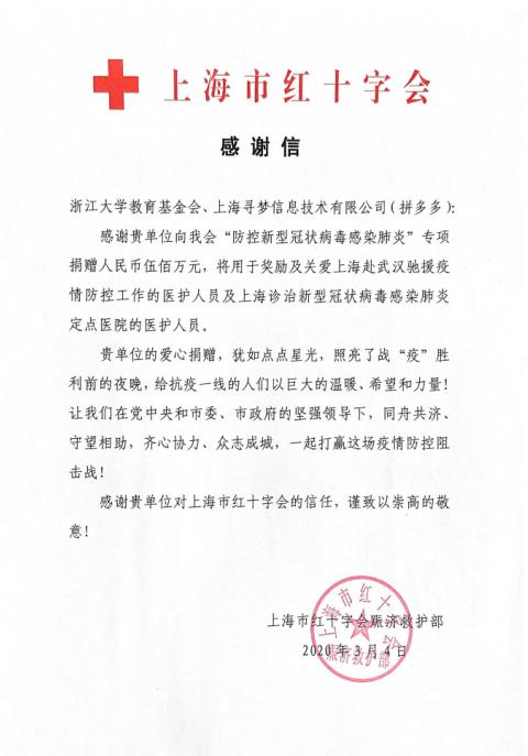 3月4日,上海市紅十字會(huì)給拼多多和浙江大學(xué)發(fā)來感謝信,感謝兩家單位為醫(yī)護(hù)工作人員帶來的500萬元專項(xiàng)捐贈(zèng)。