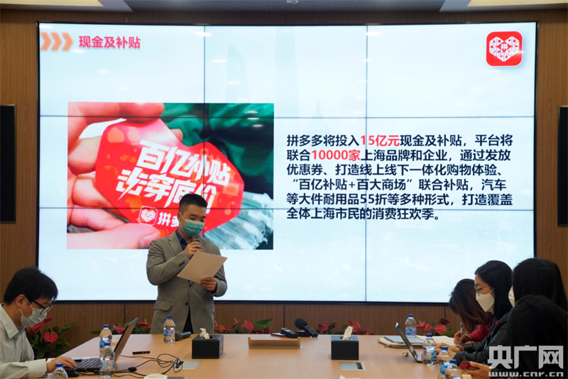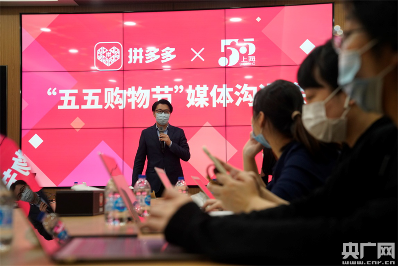 4月23日,拼多多宣布,將投入15億元現(xiàn)金及補(bǔ)貼,聯(lián)合10000家上海品牌和企業(yè),全力支持上海市“五五購(gòu)物節(jié)”。拼多多高級(jí)副總裁王堅(jiān)正在介紹平臺(tái)助力“五五購(gòu)物節(jié)”的具體舉措。(本文圖片:央廣網(wǎng)發(fā) 李勝 攝)