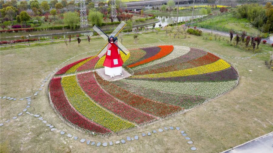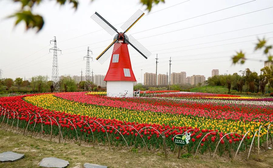 在菊?qǐng)@百果園,五彩斑斕的郁金香朵朵飽滿,宛如酒杯,在微風(fēng)中與大風(fēng)車造景相映成趣,形成了獨(dú)具特色的“小荷蘭”景觀。