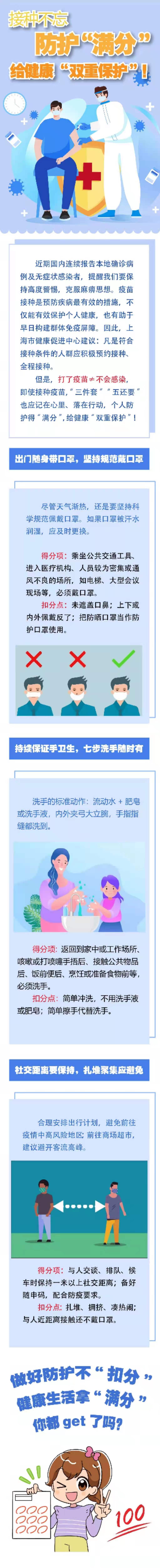 但是,打了疫苗≠不會(huì)感染,即使接種疫苗,“三件套”“五還要”也應(yīng)記在心里、落在行動(dòng),個(gè)人防護(hù)得“滿分”,給健康“雙重保護(hù)”!