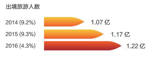 截至2017年1月,持中國普通護照可以有條件免簽或落地簽前往的國家和地區(qū)已達61個,相比去年同期增加9個。隨著2016年中國護照的含金量大幅提升、收入增長和旅游消費升級推動等因素影響下,我國繼續(xù)蟬聯(lián)全球出境旅游人次世界冠軍。據(jù)了解,中國已經(jīng)成為泰國、日本、韓國、越南、俄羅斯、馬爾代夫、英國等多個國家的第一大入境旅游客源地。然而,每年只有不到全國人口10%的公民參與出境游,擁有出境證件的國人只占總?cè)丝诘?0%,可見出境游發(fā)展依然潛力無窮。