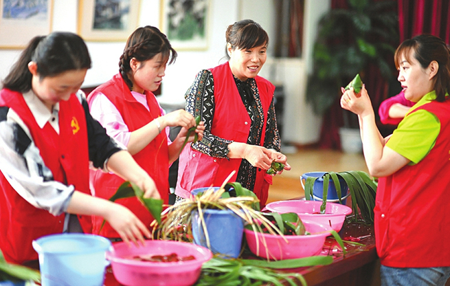 6月3日,志愿者和居民們正在開(kāi)心地一邊包粽子一邊嘮家常。當(dāng)日,太原市迎澤街道青年路一社區(qū)志愿者提早備好原料,邀請(qǐng)社區(qū)困難家庭居民,歡聚一堂包粽子,共話(huà)美好生活。(記者李兆民攝)