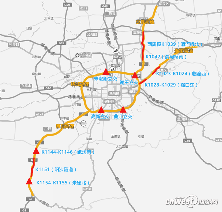 其中,京昆高速西漢段河池寨至澇峪口、西安繞城高速全段、連霍高速西臨段、京昆高速西禹段流量相對(duì)集中,其他路段較平日大幅增加,各收費(fèi)站口將出現(xiàn)流量增加、擁堵的情況。