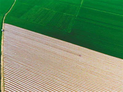 西安晚報(bào)訊 (記者 黃亞平)記者昨日上午驅(qū)車來(lái)到長(zhǎng)安區(qū)砲里塬,公路兩邊的農(nóng)田里一行行,一列列西瓜地膜整齊劃一、雪白如銀,宛若徐徐打開的一幅幅畫卷一般。