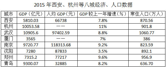 另11城中,天津、成都、重慶就綜合實力而言成為國家中心城市極有可能。沈陽、南京、武漢、西安、杭州、青島、鄭州、廈門中,以2015年為例,西安在經(jīng)濟(jì)指標(biāo)、人口數(shù)量排名靠后,雖無明顯優(yōu)勢,但仍具競爭力。