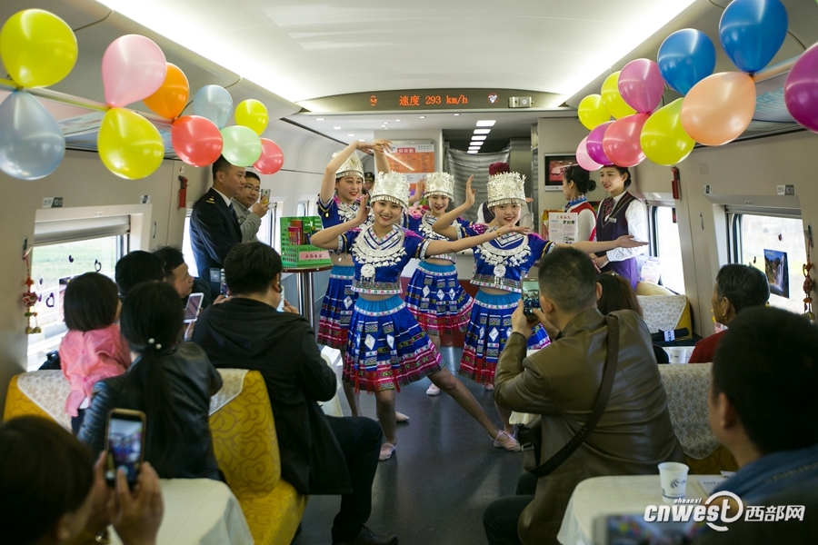 4月1日,西安北至貴陽(yáng)北的G862次列車上,身穿民族特色服飾的列車工作人員在為旅客表演節(jié)目。(圖/王曙天)