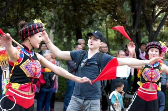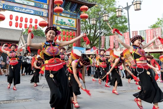 圖為身著土家族民族服裝的幺妹西安街頭玩“快閃”。