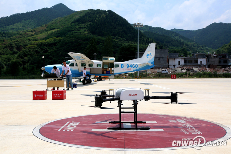 西部網(wǎng)訊(記者劉望)6月20日,隨著塞斯納208型飛機攜帶生鮮貨品從陜西蒲城降落到陜西丹鳳機場,國內(nèi)首個通航短途貨運在陜西進入驗證的關鍵環(huán)節(jié),隨后,貨品快速轉(zhuǎn)至京東無人機貨箱后并飛往周邊末端站點,完成“最后一公里”配送工作。