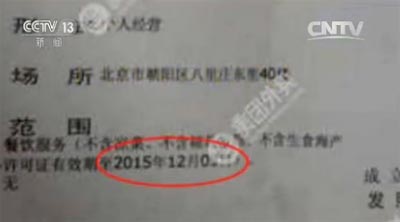 在美團外賣的應用平臺上,央視記者隨機搜索到一家“萬記麻辣燙”的商家,登記在平臺上的地址為:朝陽區(qū)八里莊東里小區(qū)41棟西側。而在美團外賣平臺上商家資質公示的證照上,登記的卻不是同一個地址。不僅如此,餐飲業(yè)必須具備的“三證齊全”卻只有“營業(yè)執(zhí)照”和“餐飲服務許可證”兩證,而且這兩個證件上清晰地顯示,有效期截止日期均為2015年12月。