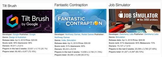 SteamSpy是steam的數(shù)據(jù)庫(kù)網(wǎng)站,就如同它的名字一般,真的是像個(gè)間諜一樣可以在上面查到所有你想要的關(guān)于steam的數(shù)據(jù),如購(gòu)買人數(shù)、實(shí)時(shí)在線人數(shù)、玩的時(shí)長(zhǎng)等。HTC vive于2016年4月發(fā)貨,在4月-7月這段早期發(fā)售時(shí)間里vive以捆綁銷售的方式捆綁了3款游戲《Tilt Brush[iii]》、《FantasticContraption[iv]》和《Job Simulator[v]》在vive里,那么通過(guò)看這段時(shí)間里這3款游戲的持有人數(shù)量就能大致的推斷截止7月底HTC vive的銷量。如下圖: