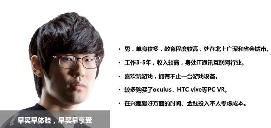 這類用戶的精力旺盛,追逐刺激體驗(yàn),大都在購(gòu)買前有在各種渠道(借別人的、體驗(yàn)店等)體驗(yàn)過(guò),對(duì)VR帶來(lái)的全景體驗(yàn)覺(jué)得新奇,對(duì)VR游戲特別期待。猴急猴急的想自己擁有一臺(tái)VR,覺(jué)得酷斃了。這里想想自己當(dāng)年想買游戲機(jī)時(shí)候急切的心情就是了。