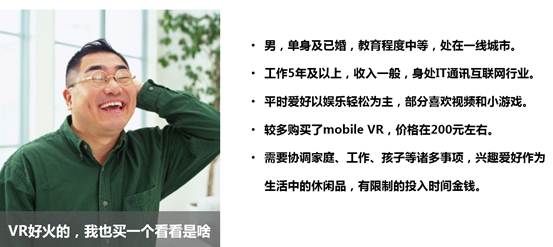 在研究中提煉到的第二類典型用戶也很有意思,他們是VR的跟風(fēng)購(gòu)買者,同時(shí),他們也是性價(jià)比追求者。他們清楚VR目前在這個(gè)階段尚不成熟,但同時(shí)又想跟風(fēng)體驗(yàn),所以他們不會(huì)花很大的價(jià)錢去追逐購(gòu)買。他們也明白自己是跟風(fēng)體驗(yàn),所以只會(huì)為這種跟風(fēng)體驗(yàn)支付相應(yīng)的低成本費(fèi)用,主要購(gòu)買Mobile VR,價(jià)格在200元左右。也并不是他們付不起,只是覺(jué)得不值當(dāng)。