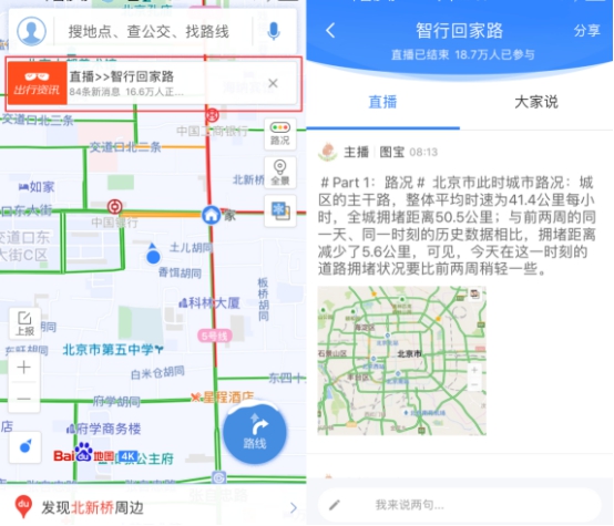 直播過程中,用戶可以很方便地進(jìn)入直播間:打開百度地圖APP,可以看到頁(yè)面最上方的“智行回家路”直播入口提醒,點(diǎn)擊后即可進(jìn)入直播間,有直播主持人“圖寶”隨時(shí)為大家更新路況信息,例如上午8點(diǎn)13分,圖寶對(duì)北京市城區(qū)路況做了及時(shí)播報(bào),信息顯示主干路整體平均時(shí)速為41.4公里每小時(shí),全城擁堵距離50.5公里等,為即將出城用戶提供最強(qiáng)參考。