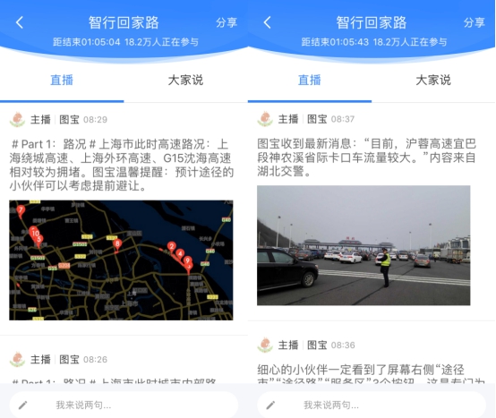 重要出行信息的直播,離不開百度地圖與權(quán)威部門的合作。此次直播,百度地圖聯(lián)合了上海交委、遵義蘭海交警、蘇州交警、黔南交警、湖北交警、浙江衢州支隊(duì)、廣東交通廣播、江西交通廣播、楚天交通廣播、湖南交通頻道等多地權(quán)威部門,做到將城市路況、高速路況、車流量等重要出行信息第一時(shí)間智能播報(bào)。而由百度地圖智慧交通新平臺(tái)以及螞蟻團(tuán)隊(duì)即時(shí)提供和回傳的交通信息,也確保了直播間信息發(fā)布的及時(shí)和全面。