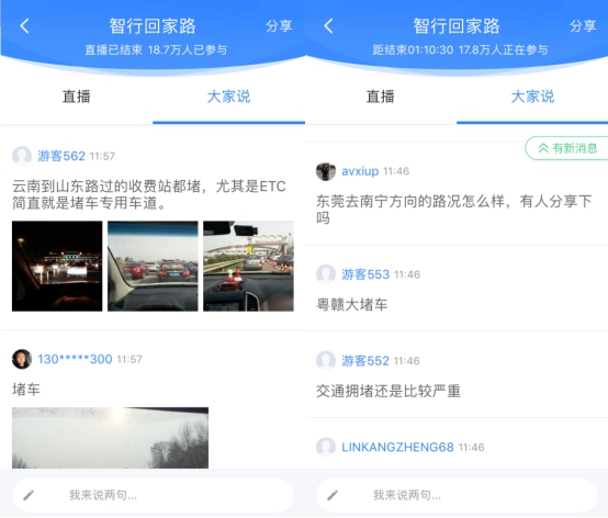 除了在百度地圖“智行回家路”直播間查看權(quán)威交通信息發(fā)布,每一位用戶也可以在“大家說”版塊兒發(fā)布消息,分享自己周邊的路況或突發(fā)事故給他人提供參考,群策群力讓春節(jié)返鄉(xiāng)更暢通、更高效。