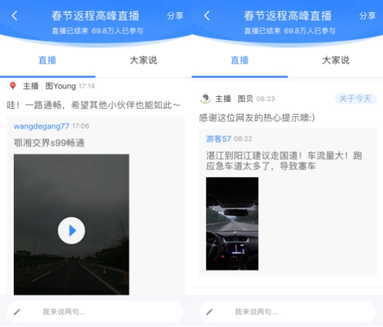 2月3日,大家迎來(lái)了節(jié)后第一個(gè)工作日。昨天——春節(jié)長(zhǎng)假最后一天,車流、客流集中返程,再加上高速免費(fèi),很多人經(jīng)歷了一場(chǎng)節(jié)后返程“大作戰(zhàn)”。為了幫助廣大用戶合理安排出行計(jì)劃順利返程,2月2日早上8點(diǎn),百度地圖及時(shí)上線“返程交通直播”:直播開(kāi)啟第一個(gè)小時(shí)內(nèi),就有累計(jì)20萬(wàn)人涌入直播間參與互動(dòng),刷新直播間記錄;直播一直持續(xù)到下午6點(diǎn),長(zhǎng)達(dá)10個(gè)小時(shí),總參與人數(shù)達(dá)到69.8萬(wàn)。