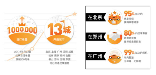 近日,滴滴出行通過其官方微信號公布了滴滴優(yōu)享日單量突破100萬的成績單,拿下網(wǎng)約車中端市場。2月末上線至今,優(yōu)享已在北、上、廣、深、杭、南京等13個城市提供服務(wù)。其中,在北京95%以上的優(yōu)享行程獲乘客好評,在鄭州80%的乘客愿意向親友推薦優(yōu)享服務(wù)。