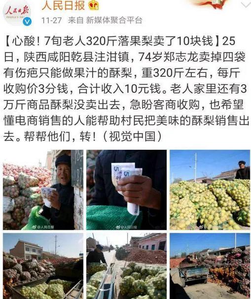 在2017年11月,陜西咸陽乾縣74歲的鄭志龍老人賣掉320斤酥梨,卻只收入10元錢,每斤梨只賣了3分錢。多么黑心的人才能開出這樣的價格,在獲知乾縣酥梨滯銷的消息后,京東生鮮在第一時間聯(lián)合中國特產永壽館,通過京東秒殺、京東拼購、優(yōu)惠券等促銷形式,通過一次活動就幫助乾縣銷售滯銷酥梨超過10萬斤,解了村民的燃眉之急。